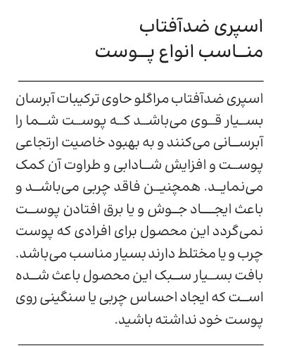 بدون چربی مناسب استفاده تمامی تایپ های پوستی حاوی فاکتور های محافظتی سه پرتو اشعه ی اب (blue light , uvb,uva)با بافتی بسیار سبک حاوی ترکیباتی آبرسانی و کمک به بهبود خاصیت ارتجاعی و طراوت پوست
