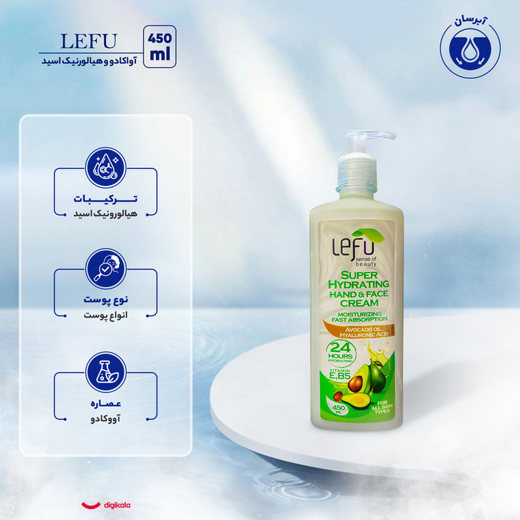 کرم آبرسان لفو، مدل آواکادو و هیالورنیک اسید، مناسب انواع پوست، حاوی آلانتویین و ویتامینهای E و B5، انواع آنتیاکسیدانهای طبیعی و فاکتورهای مرطوبکننده قوی، نرمکننده و شفافکننده، مناسب استفاده برای دست و صورت، حجم 450 میلیلیتر