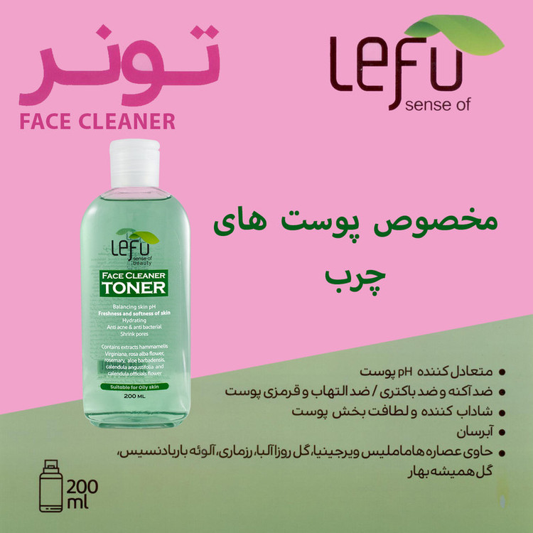 تونر پاکننده صورت ، سبز رنگ لفو مخصوص پوست ها معمولی و چرب می باشد و همچنین می تواند علاوه بر خاصیت آبرسان بودن ، PH پوست شما را متعادل کند که این موضوع باعث شادابی و درخشندگی و نرمی پوست شما می شود .